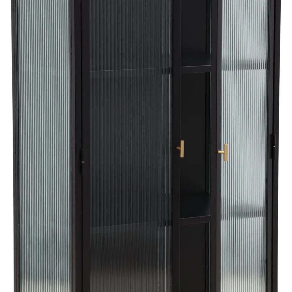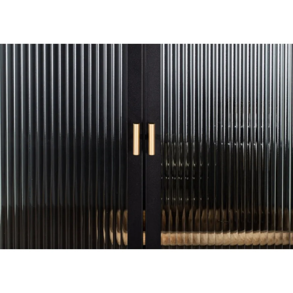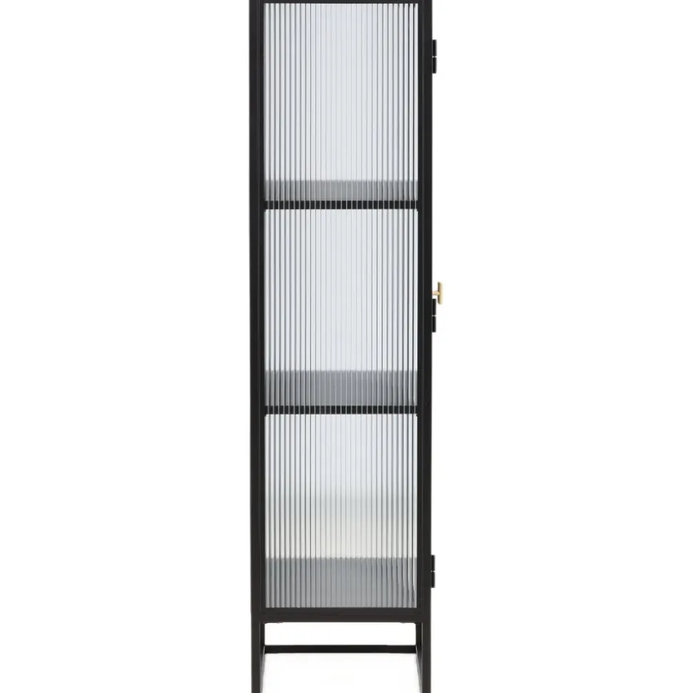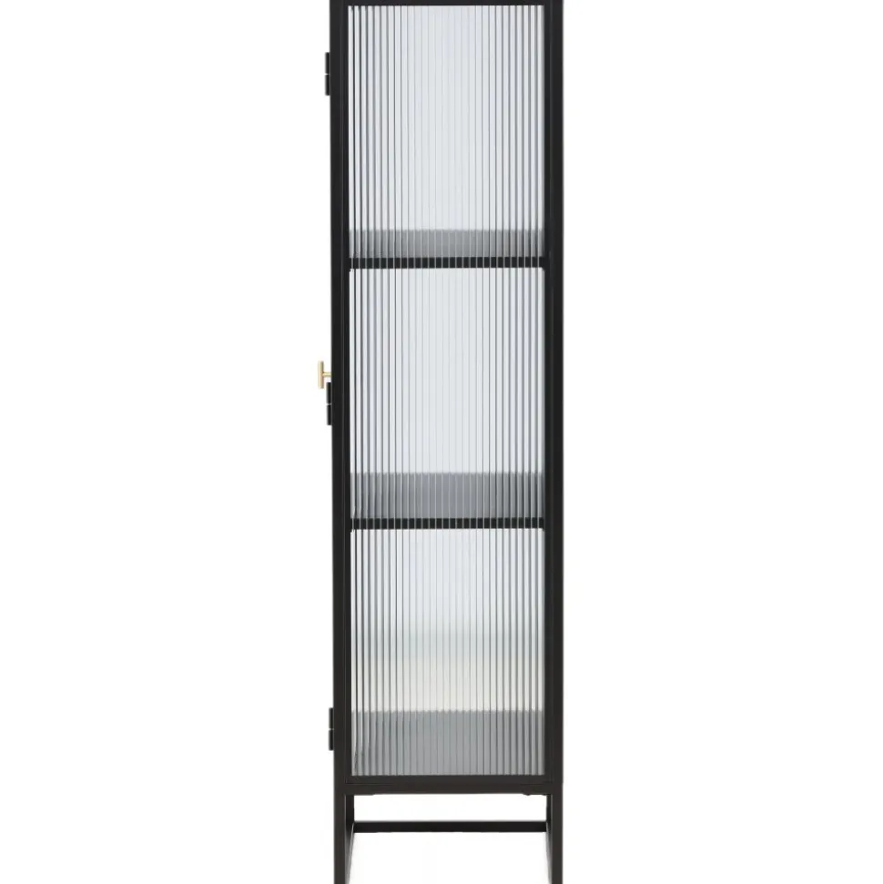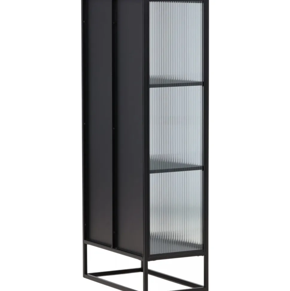 Stilrent och smart – allt man kan önska. Vårt omtyckta skåp Garis gör verkligen ett elegant intryck i vardagsrummet. Designen är iögonfallande med två höga glasdörrar i veckad design och en ram i svart pulverlackerat stål, det här skåpet står sig över tid. Dörrarna har mässingfärgade handtag vilket blir en snygg detalj. Hela skåpet vilar på en öppen ram i svart pulverlackerad stål som ger en luftig känsla och underlättar också för dammsugaren. Här får du en praktisk möbel som passar utmärkt för att förvara porslin eller annat som behöver lite extra utrymme – Inred ditt hem i en trendsäker känsla.