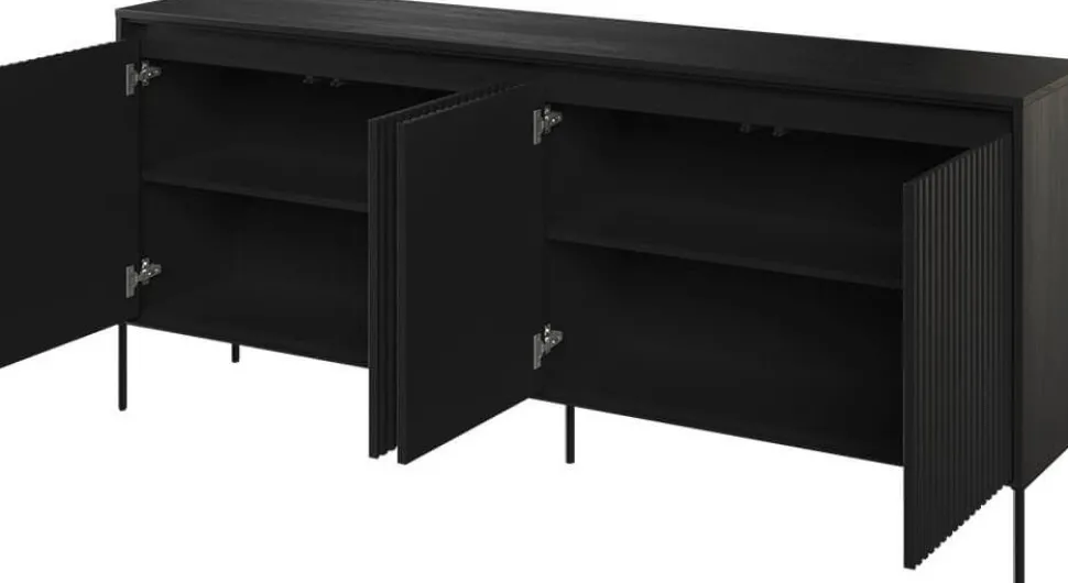 Skänk av laminerad spånskiva med LED-belysning och ben av metall. Levereras omonterad.