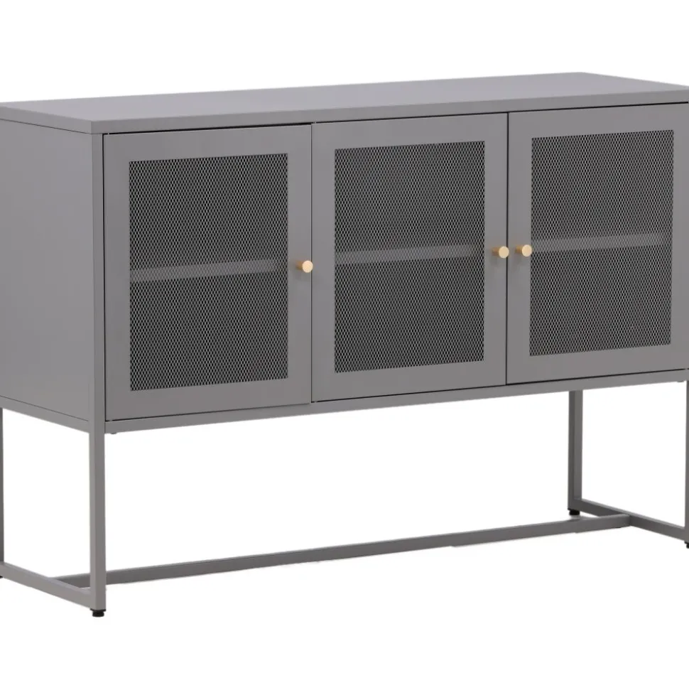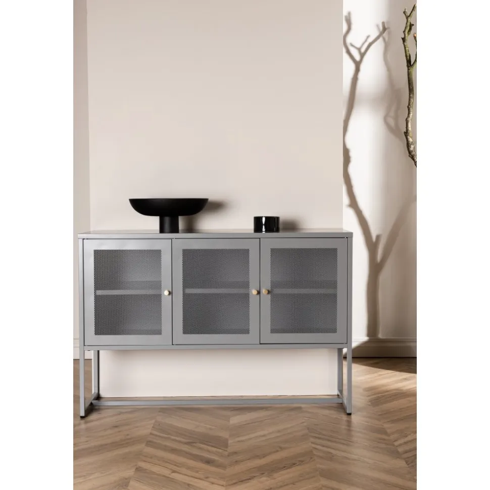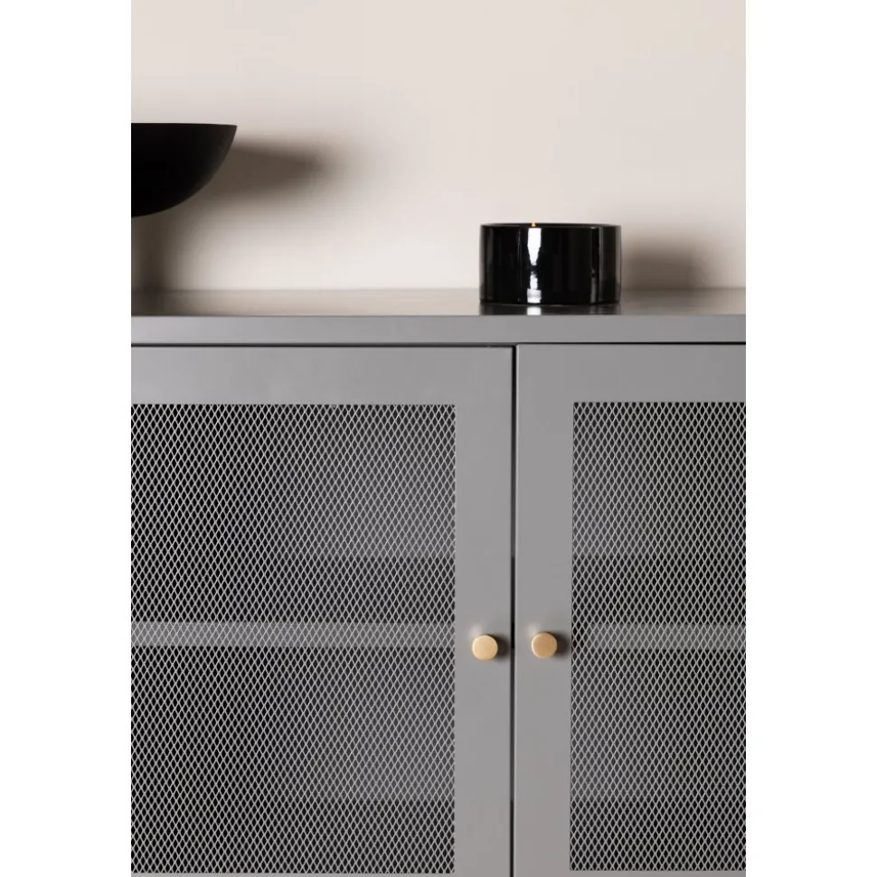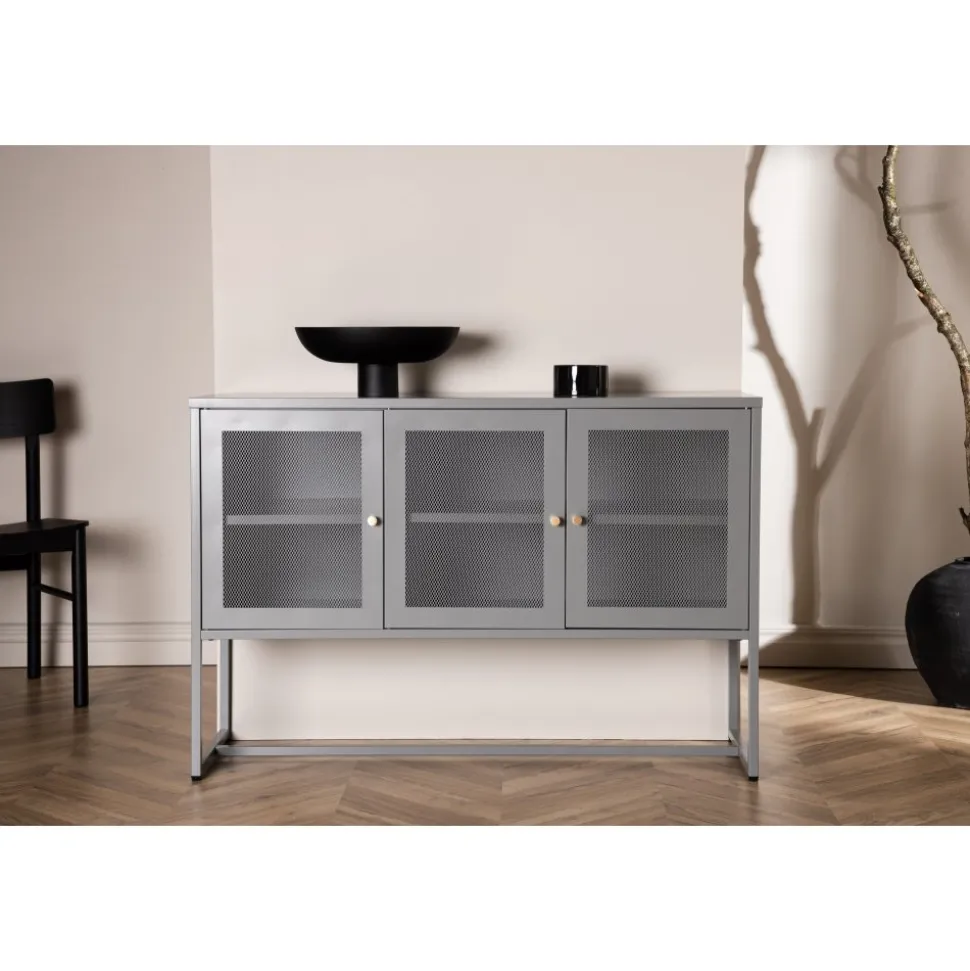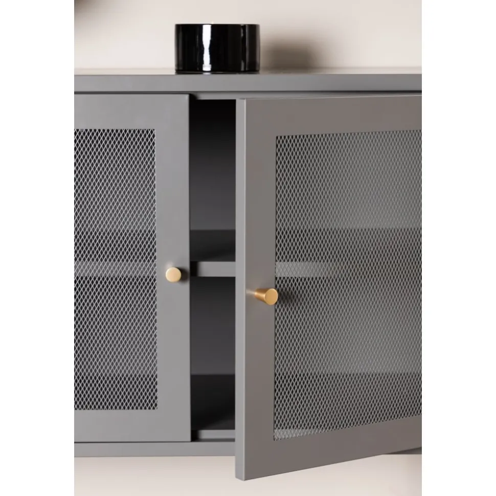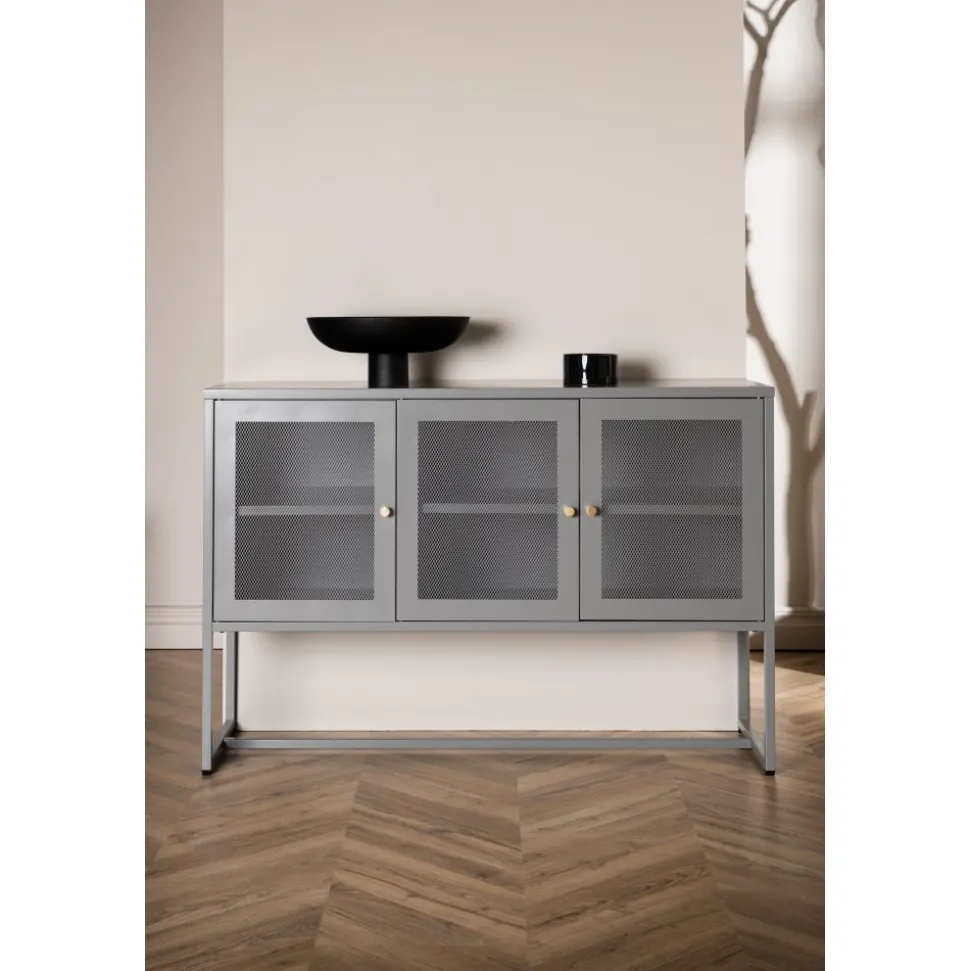 Trerike – ett modernt skåp i en tuff industriell design med läckra nätdörrar och ben tillverkade i grått pulverlackerad stål med 2 smarta hyllplan för avlastning. Skåpet lyfts upp av smala, höga ben som skapar en luftig känsla och underlättar även för dammsugaren. Den perfekta förvaringsmöbeln för allt du önskar – fyll med porslin, böcker eller vackra dekorationer. Skåpets smidiga storlek och eleganta utsida gör den lättplacerad och passar bra in i de flesta rum i hemmet, så möblera efter egna behov och önskemål.