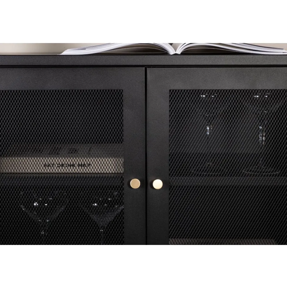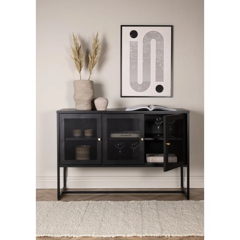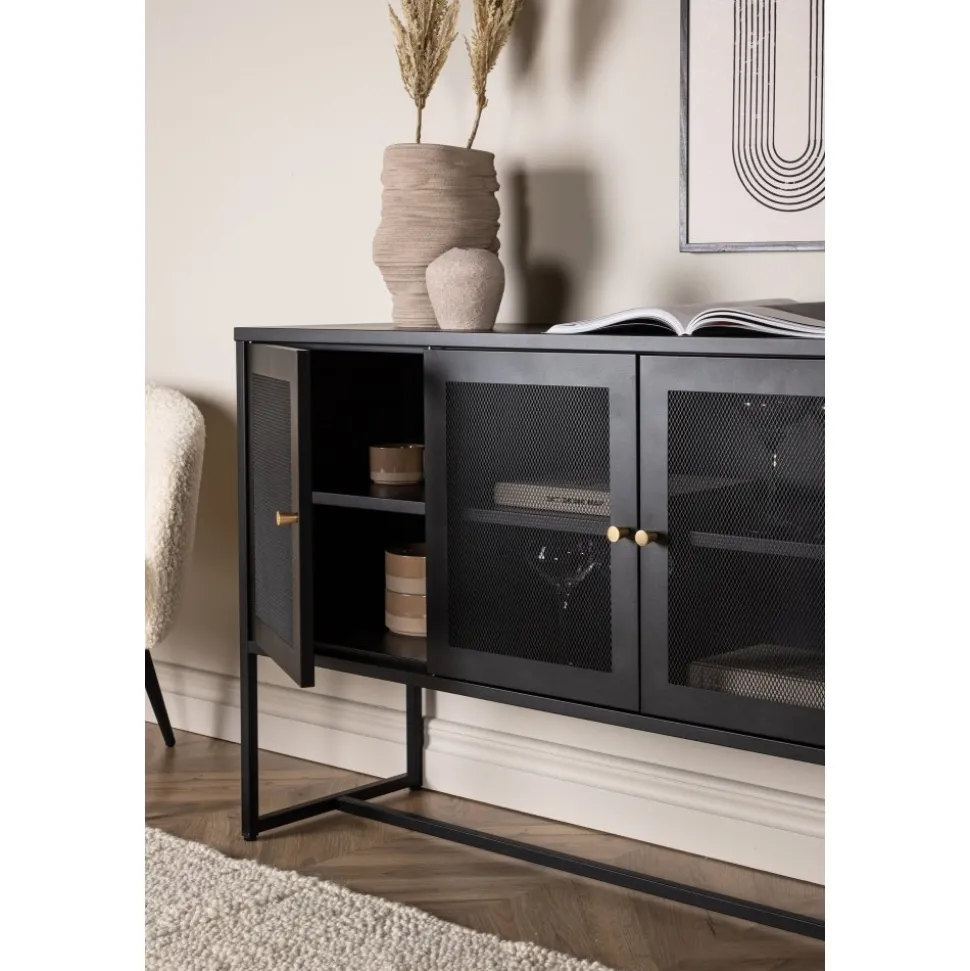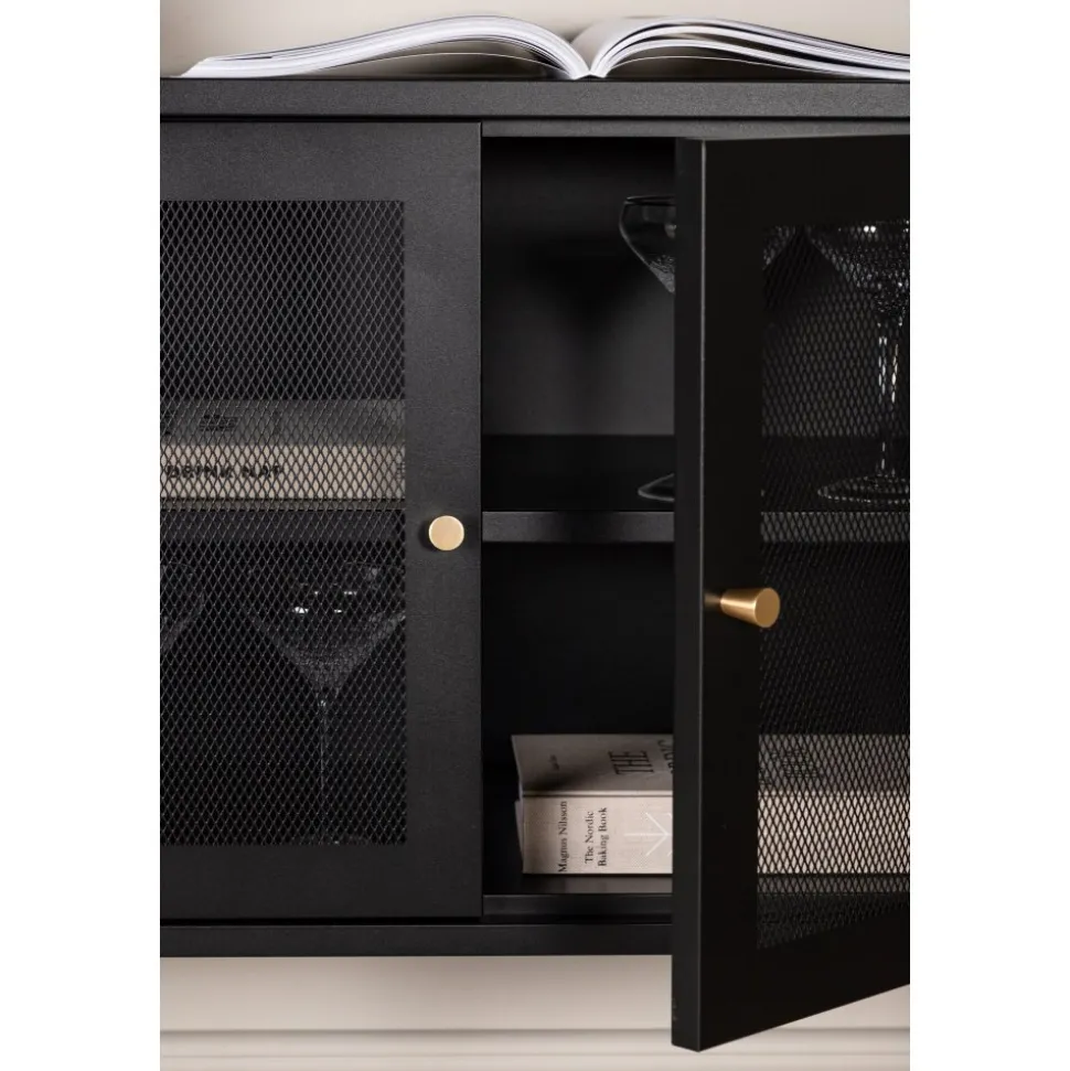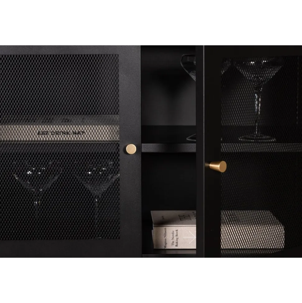 Trerike – ett modernt skåp i en tuff industriell design med läckra nätdörrar och ben tillverkade i svart pulverlackerad stål med 2 smarta hyllplan för avlastning. Skåpet lyfts upp av smala, höga ben som skapar en luftig känsla och underlättar även för dammsugaren. Den perfekta förvaringsmöbeln för allt du önskar – fyll med porslin, böcker eller vackra dekorationer. Skåpets smidiga storlek och eleganta utsida gör den lättplacerad och passar bra in i de flesta rum i hemmet, så möblera efter egna behov och önskemål.