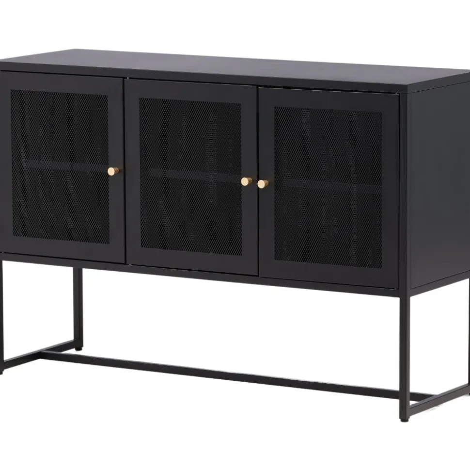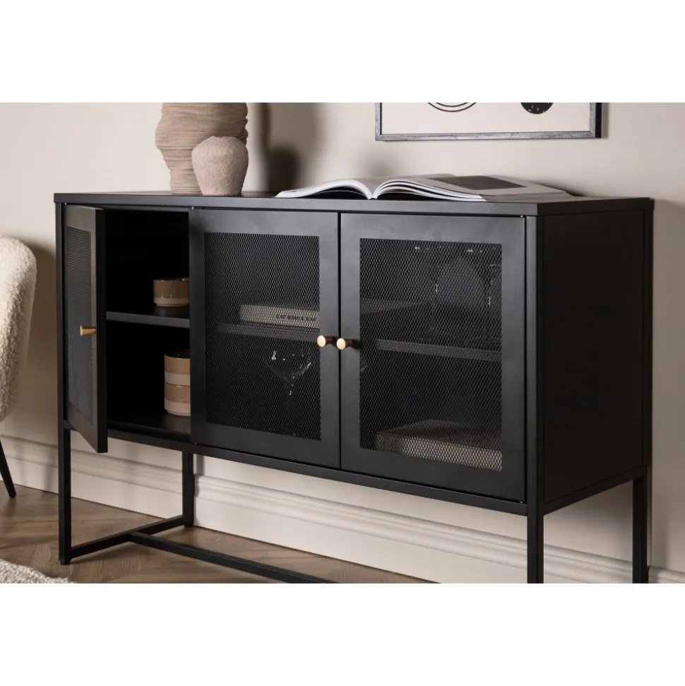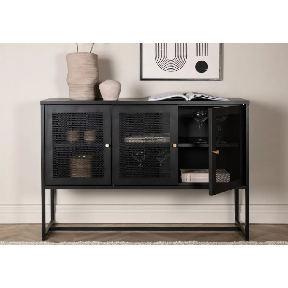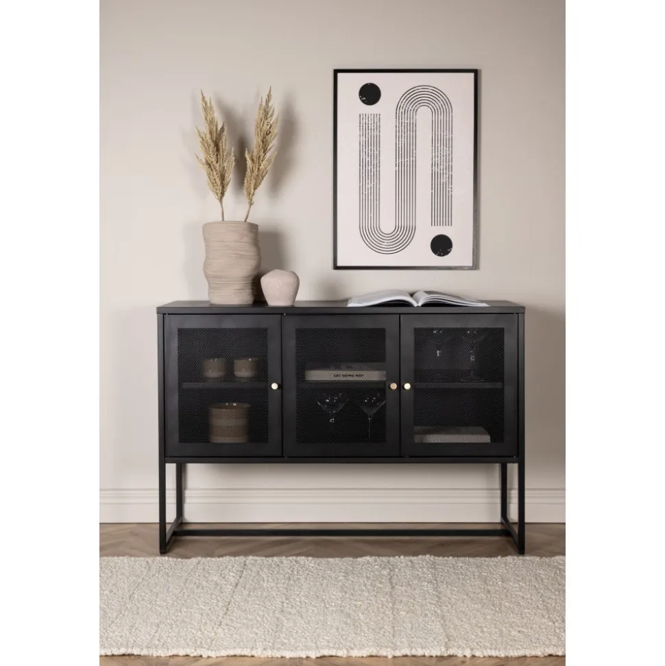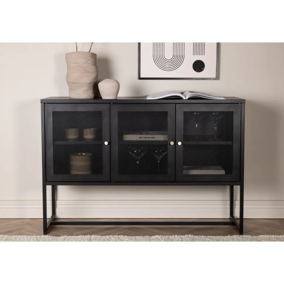 Trerike – ett modernt skåp i en tuff industriell design med läckra nätdörrar och ben tillverkade i svart pulverlackerad stål med 2 smarta hyllplan för avlastning. Skåpet lyfts upp av smala, höga ben som skapar en luftig känsla och underlättar även för dammsugaren. Den perfekta förvaringsmöbeln för allt du önskar – fyll med porslin, böcker eller vackra dekorationer. Skåpets smidiga storlek och eleganta utsida gör den lättplacerad och passar bra in i de flesta rum i hemmet, så möblera efter egna behov och önskemål.