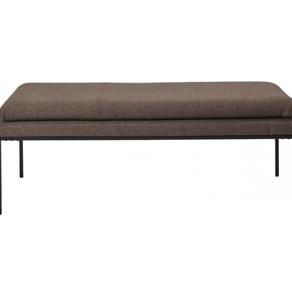 Sittbänk klädd i brunt polyestertyg med svarta metallben och dyna.