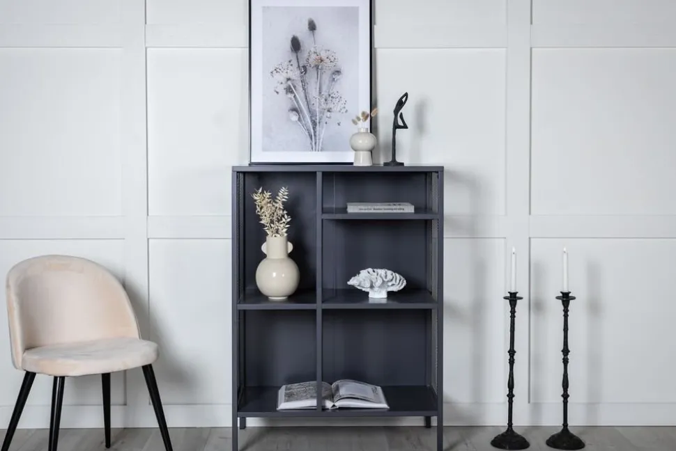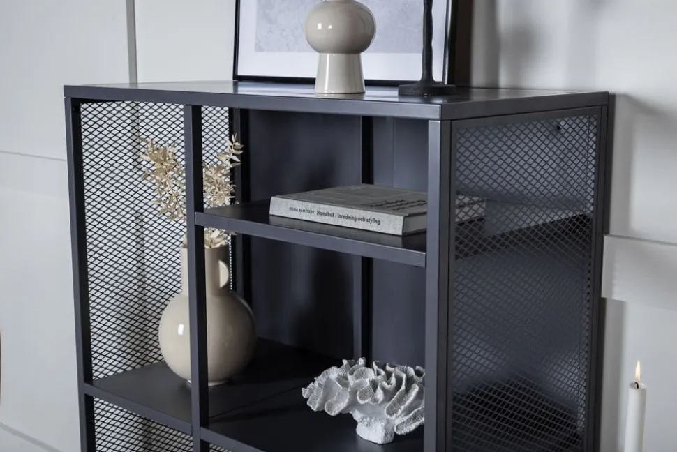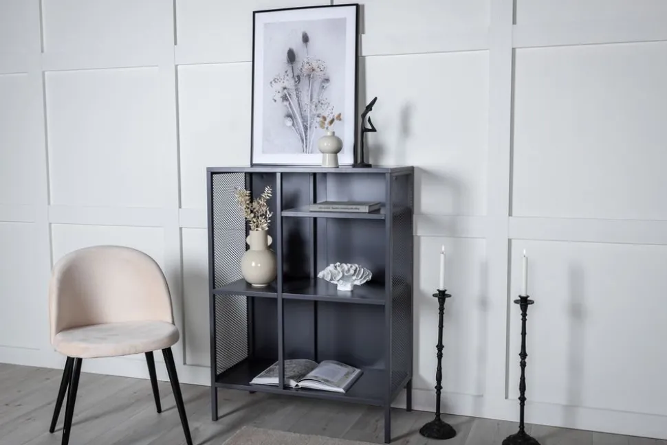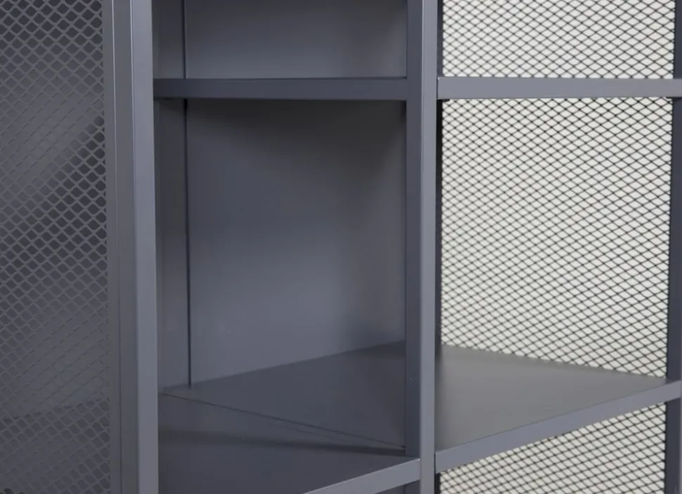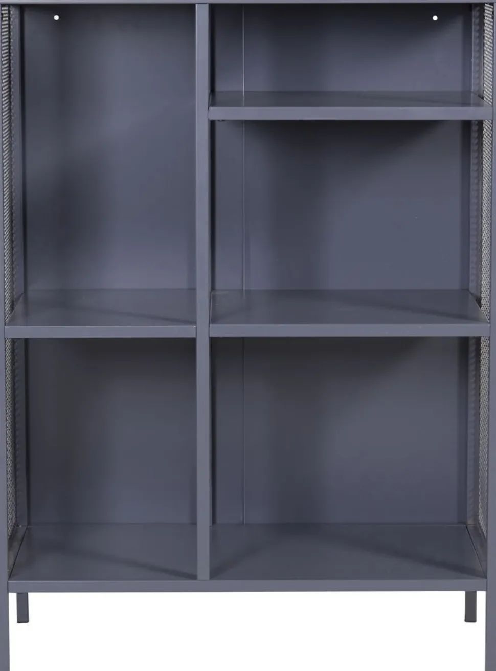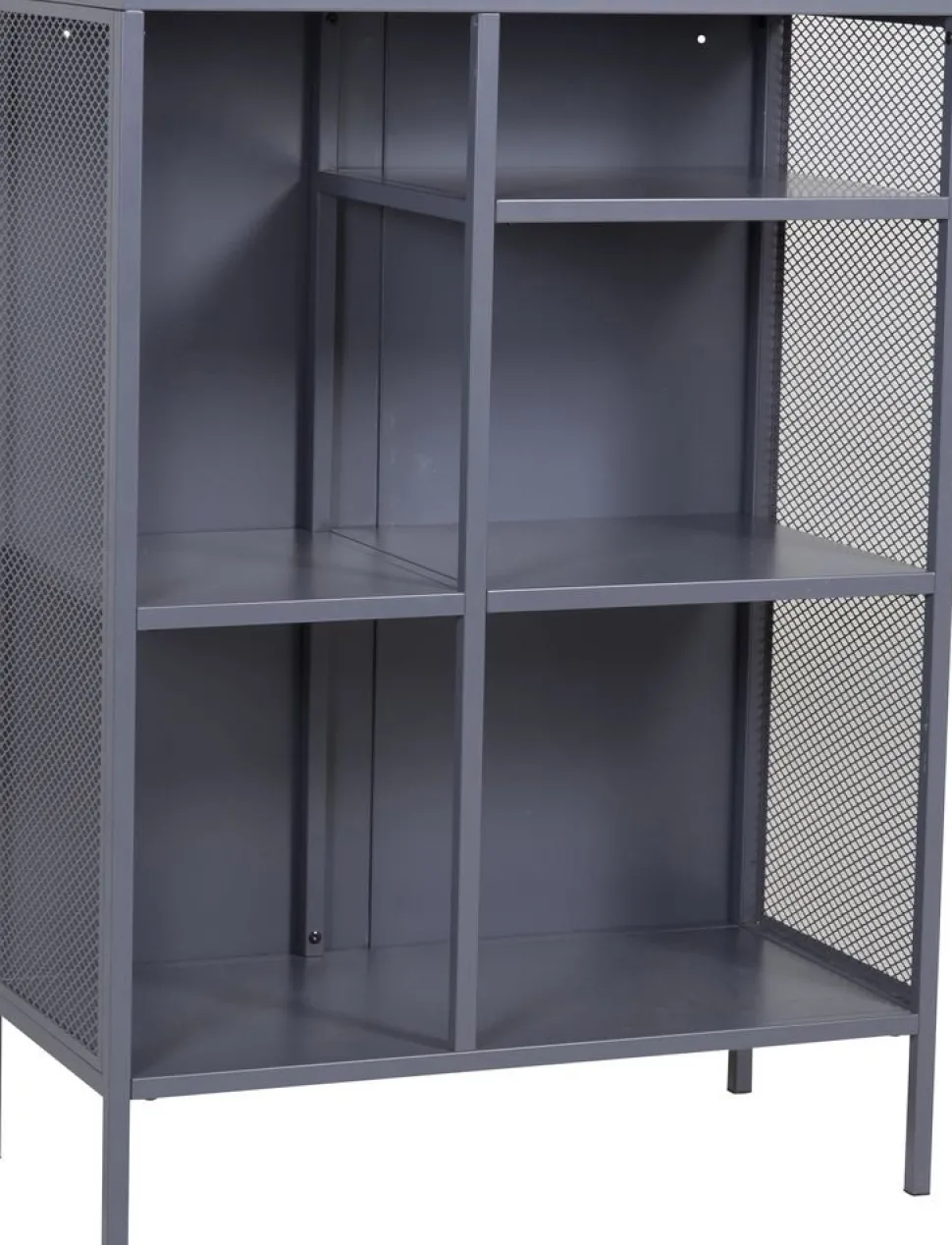 Praktiskt helt i grå pulverlackerad metall. Skåpet är utrustat med 3 hyllplan och nätade sidor, vilket gör det luftigt. Generöst med utrymme undertill.