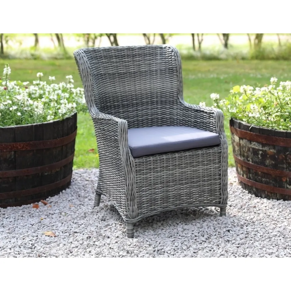 Jacksonville fåtölj i grå konstrotting, stomme av aluminium. Mörkgrå dynor av polyester för god sittkomfort.