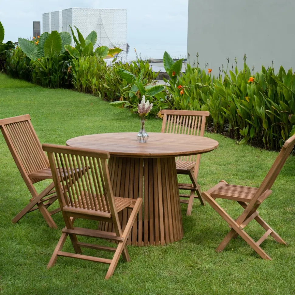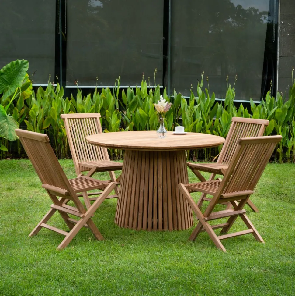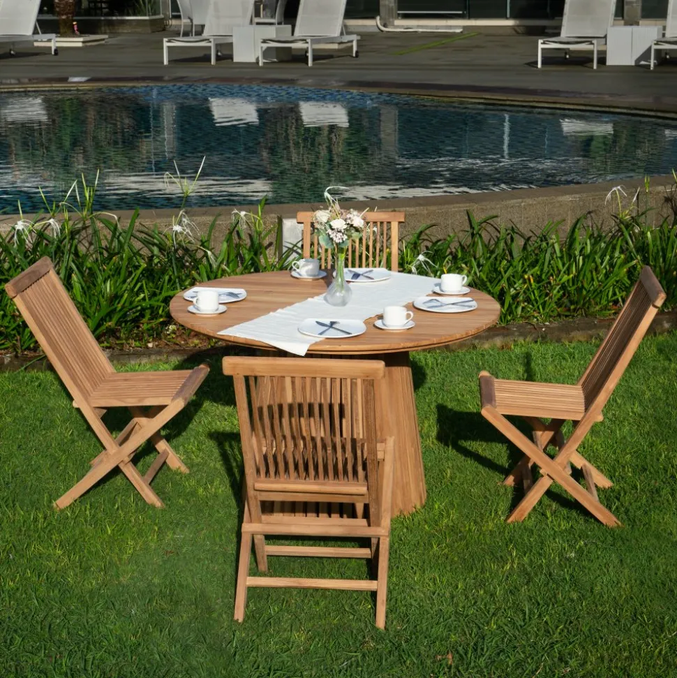 Saltö matgrupp för uteplatsen med ett runt matbord i massiv teak, tillsammans med fyra stycken stolar i massiv teak. En klassisk kombination.
