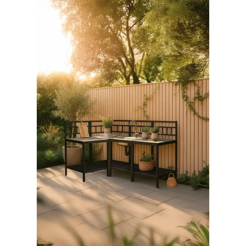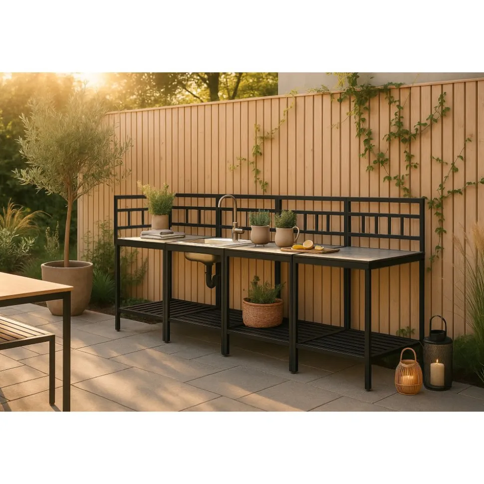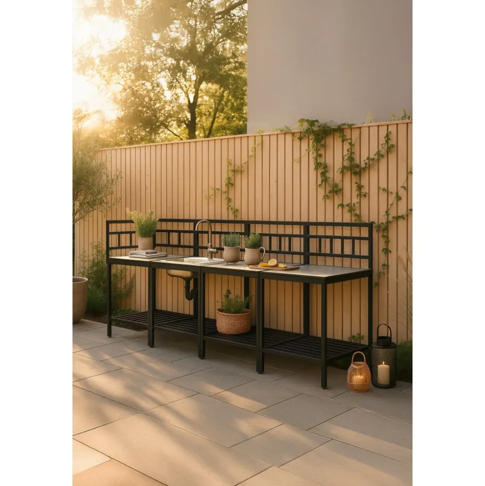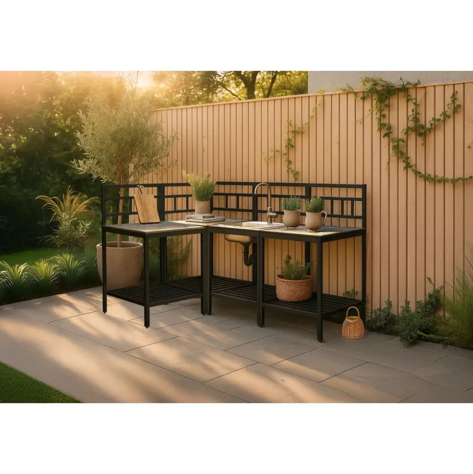 Tack vare hörnmodulen utnyttjas ytan maximalt och uteköket får en naturlig vinkel som gör arbetsflödet smidigt. Hyllplan under varje bänk ger gott om plats för redskap och tillbehör, så att allt finns nära till hands under matlagningen.
