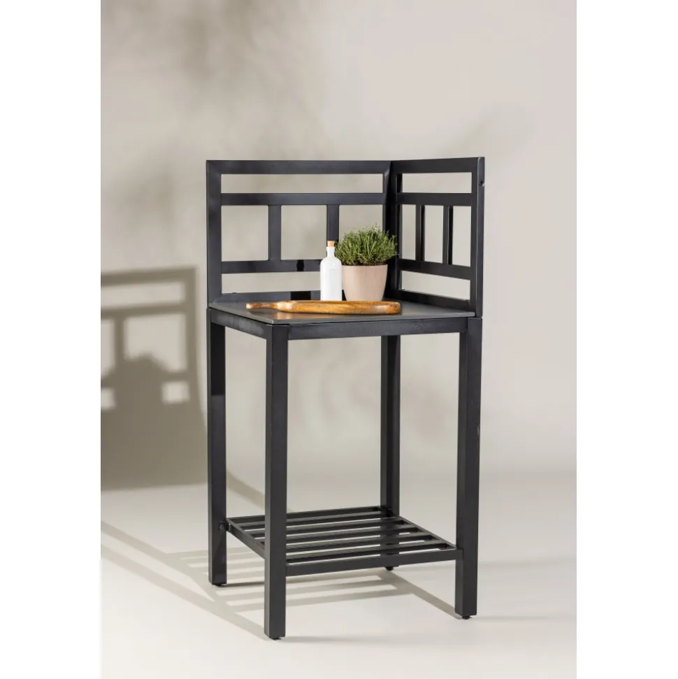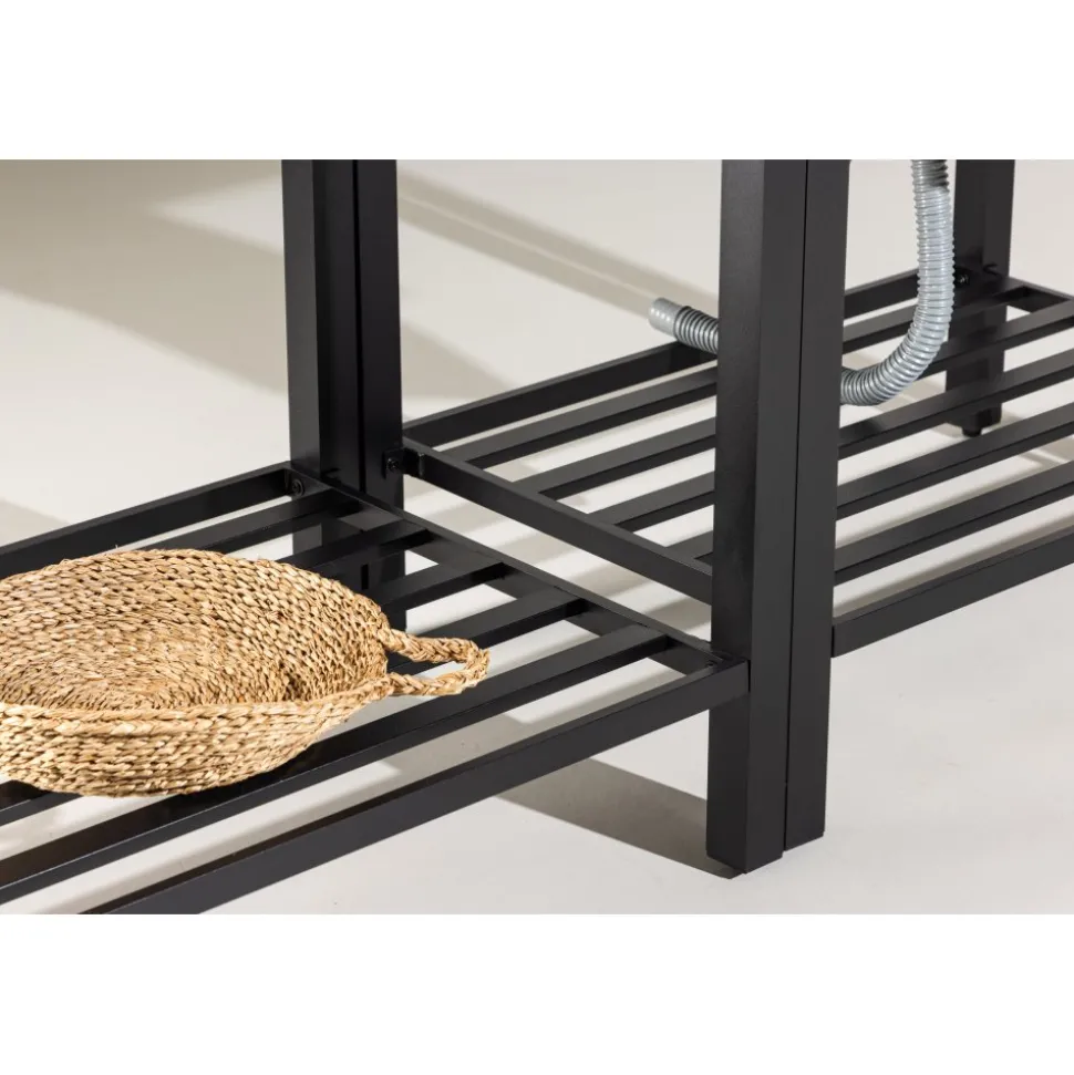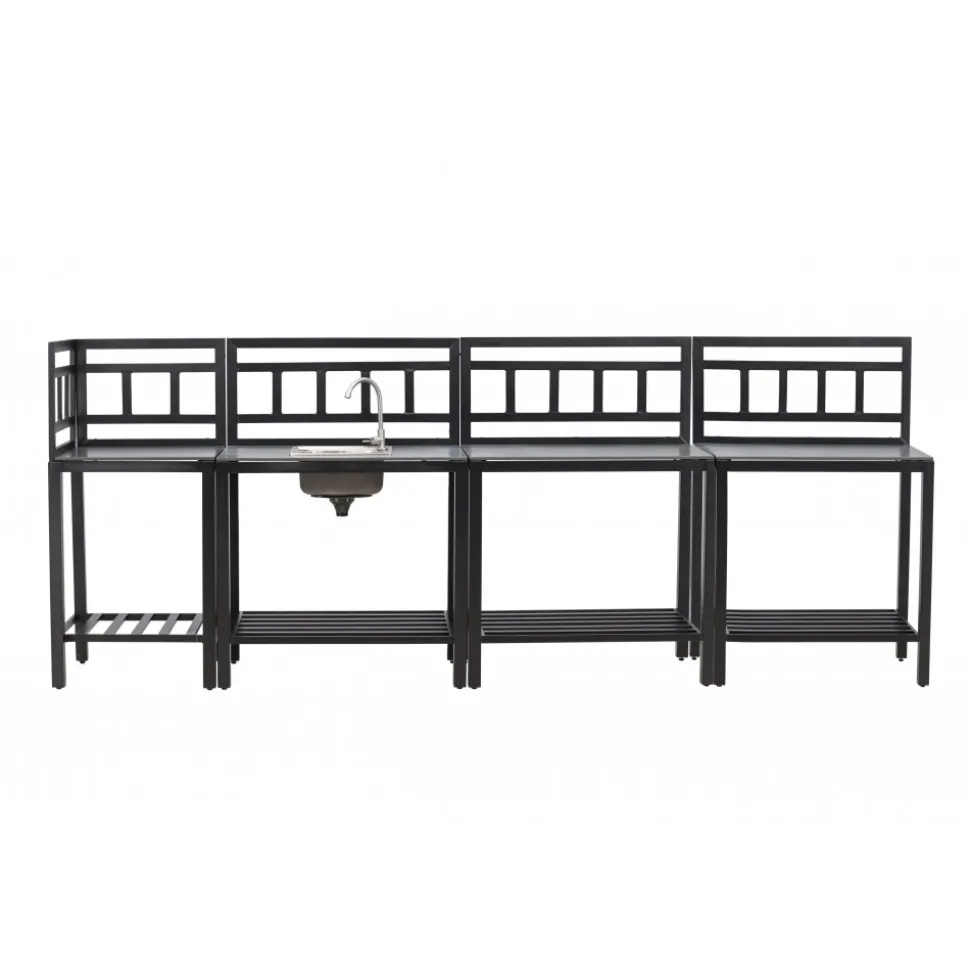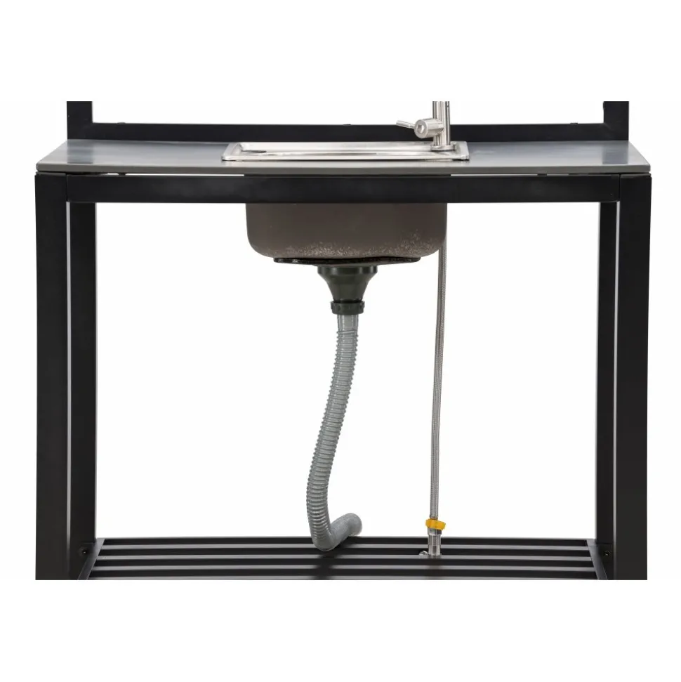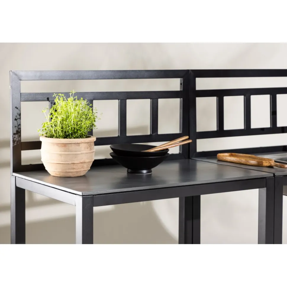 Tack vare hörnmodulen utnyttjas ytan maximalt och uteköket får en naturlig vinkel som gör arbetsflödet smidigt. Hyllplan under varje bänk ger gott om plats för redskap och tillbehör, så att allt finns nära till hands under matlagningen.