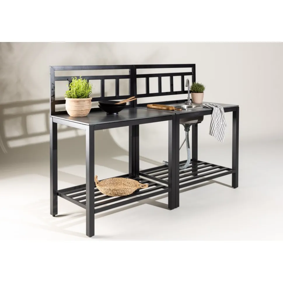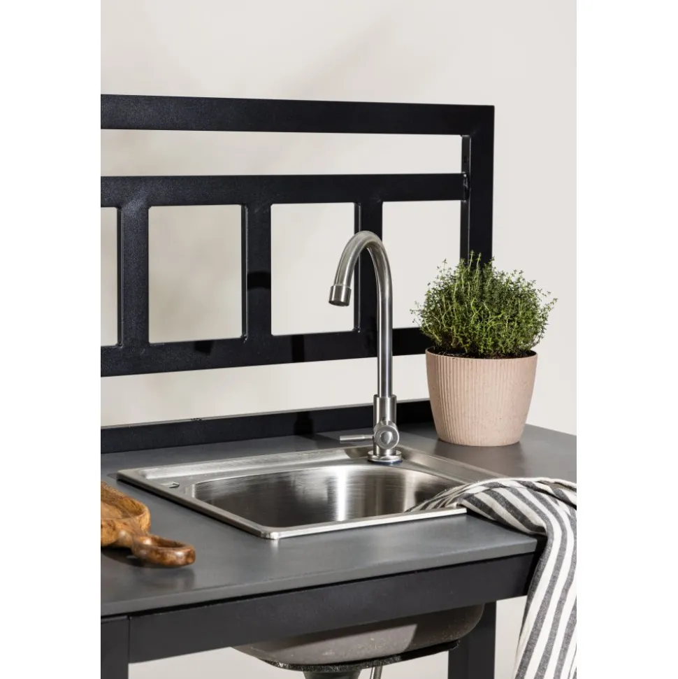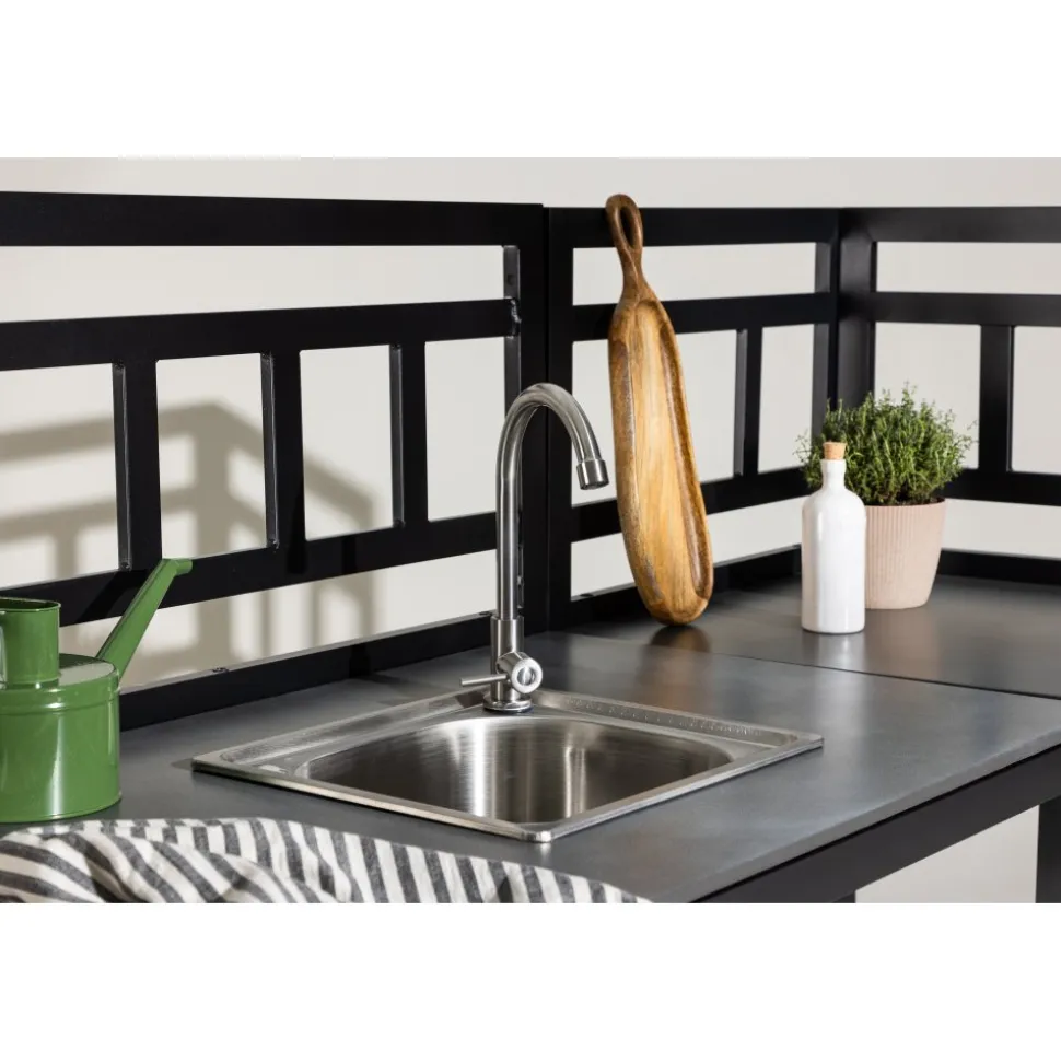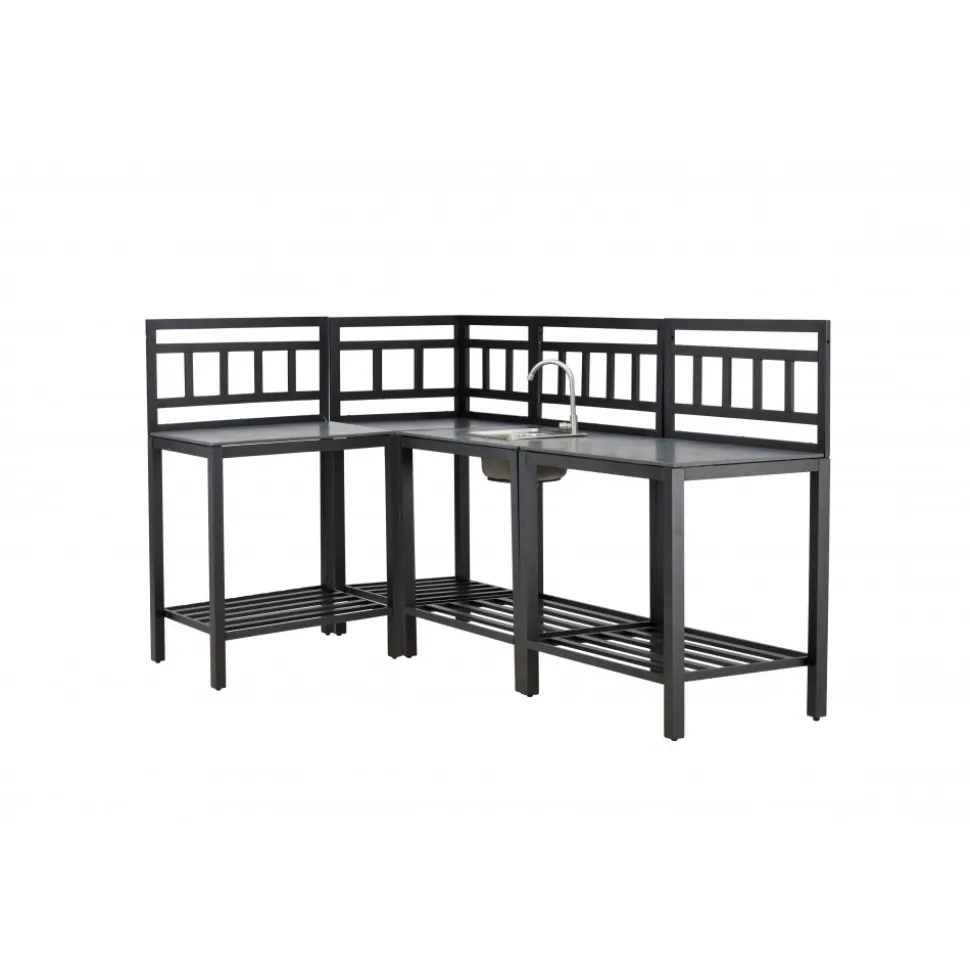 Helheten består av fem moduler: två arbetsbänkar, en bänk med förborrat hål för diskho, en hörnmodul samt en diskho i rostfritt stål med blandare och avlopp. Kombinationen skapar en generös och praktisk arbetsyta som enkelt anpassas efter plats och behov. Alla delar har en stabil stomme i svartlackerad aluminium och slitstarka skivor i grå sten, vilket ger både hållbarhet och ett stilrent uttryck.