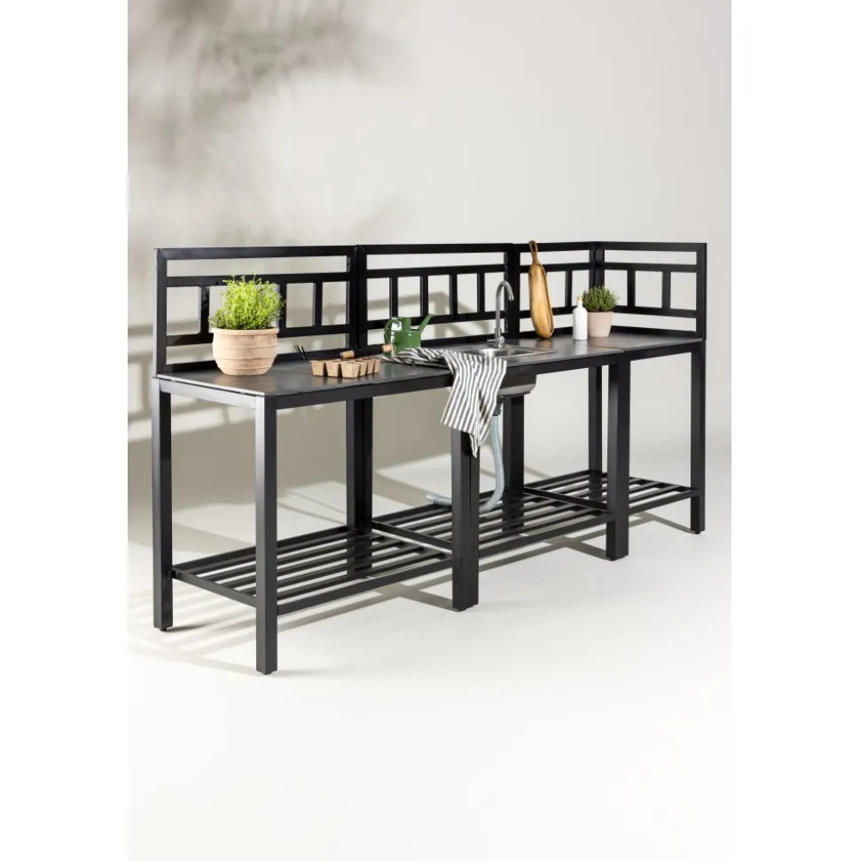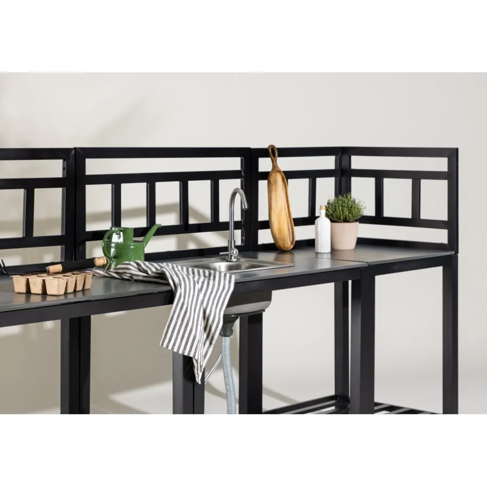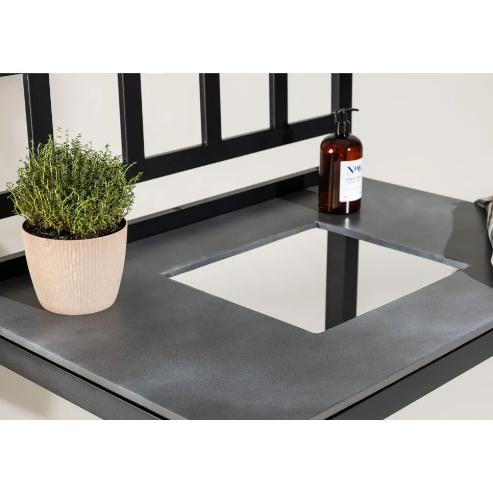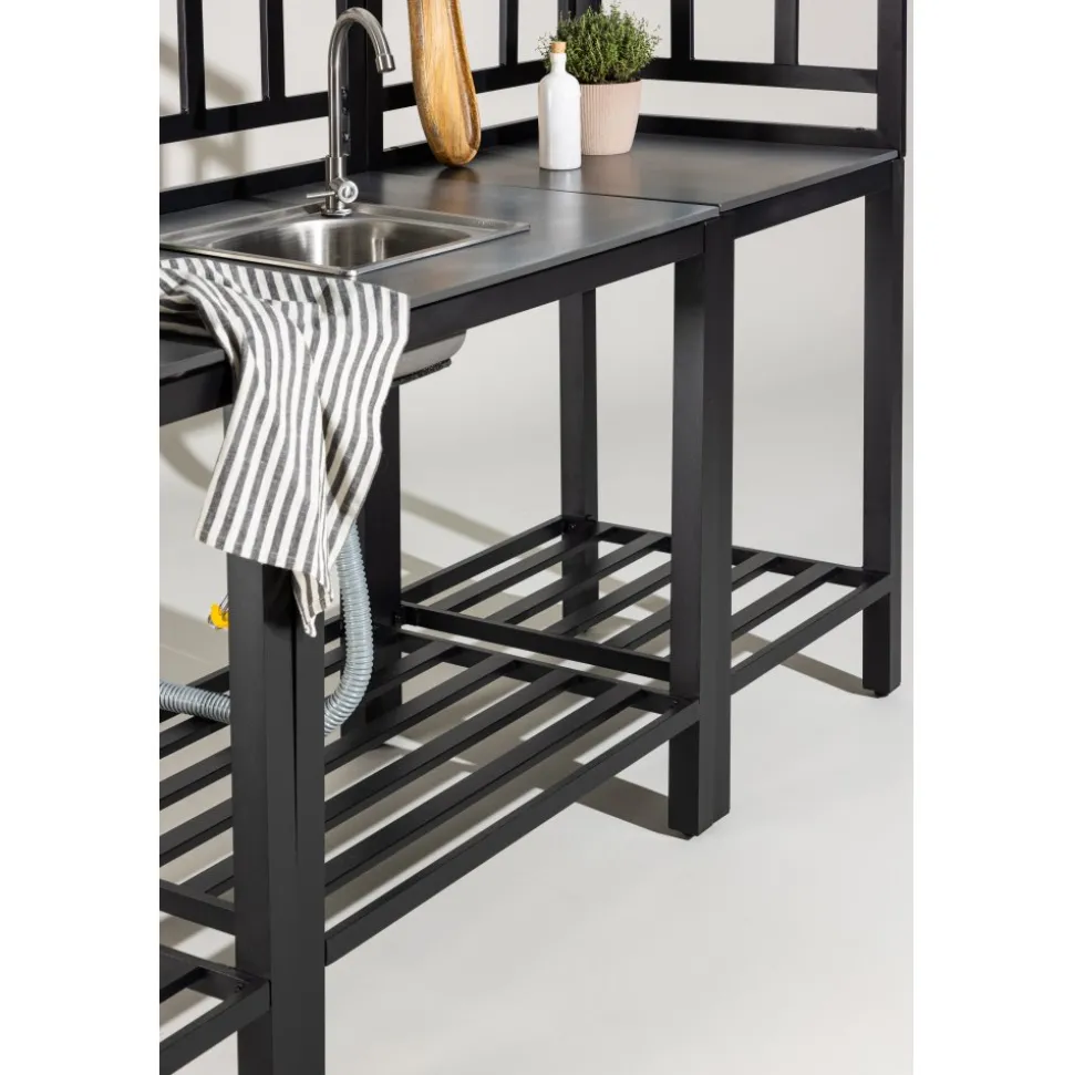 Helheten består av fem moduler: två arbetsbänkar, en bänk med förborrat hål för diskho, en hörnmodul samt en diskho i rostfritt stål med blandare och avlopp. Kombinationen skapar en generös och praktisk arbetsyta som enkelt anpassas efter plats och behov. Alla delar har en stabil stomme i svartlackerad aluminium och slitstarka skivor i grå sten, vilket ger både hållbarhet och ett stilrent uttryck.