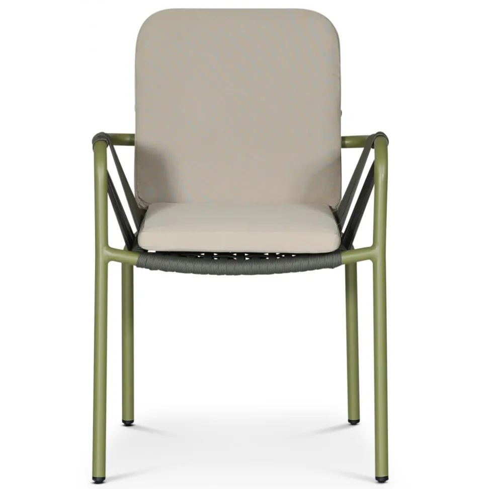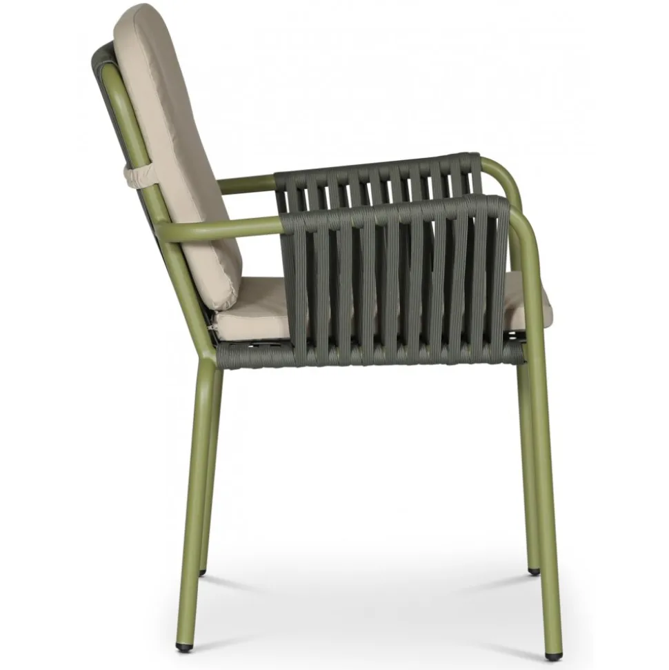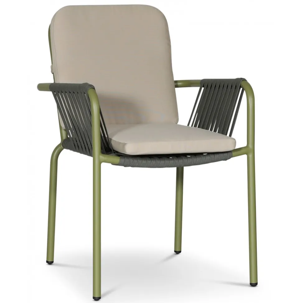 Lincoln-stolen är både snygg och praktisk perfekta valet för uteplatsen! Den har en grön aluminiumstomme som är både lätt och tålig, så du kan enkelt flytta runt den efter behov. Sitsen i rep ger en modern och luftig känsla samtidigt som den släpper igenom luft, vilket är skönt under varma sommardagar. De mjuka, beige dynorna på både sits och rygg gör stolen extra bekväm perfekt för långa middagar eller en lugn stund i solen.