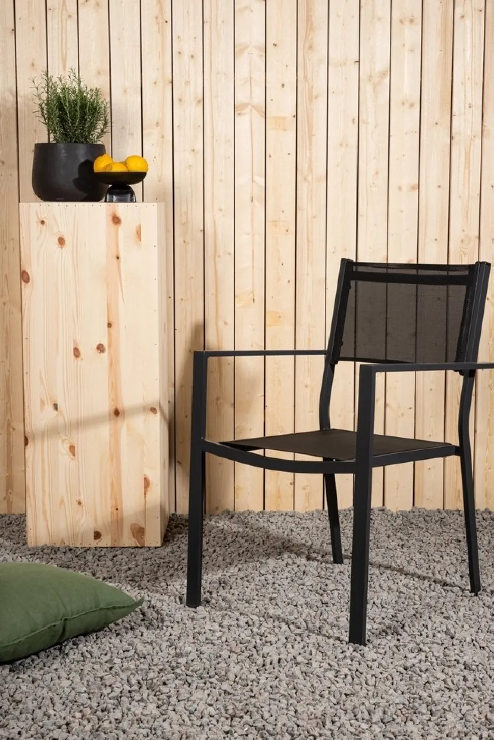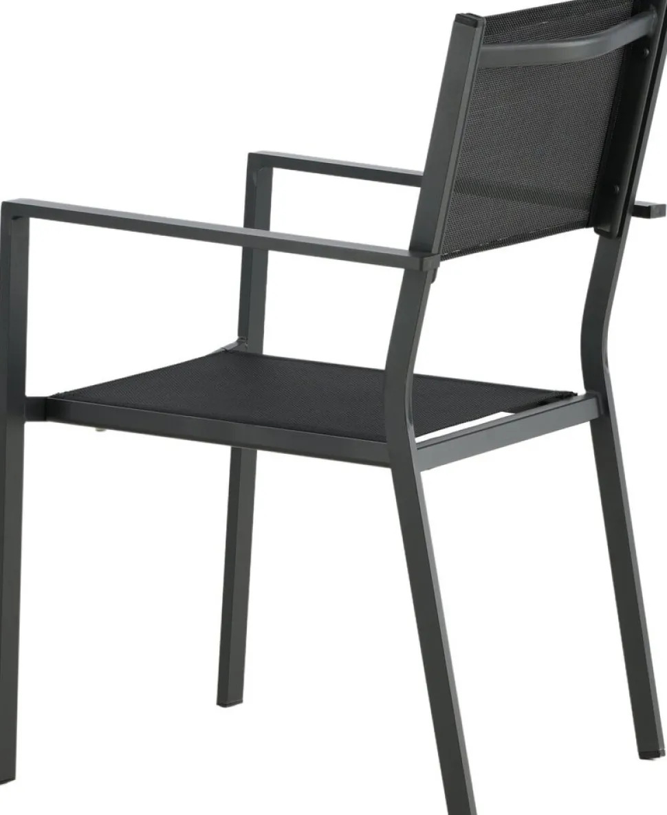 Copacabana är den ideala matstolen för din uteplats, där stil möter funktion. Den svarta aluminiumkonstruktionen ger stolen ett modernt och industriellt utseende, medan sitsen i svart textilene erbjuder både komfort och hållbarhet.
