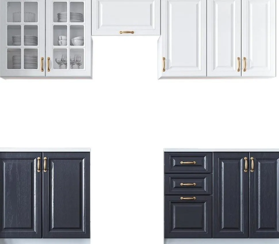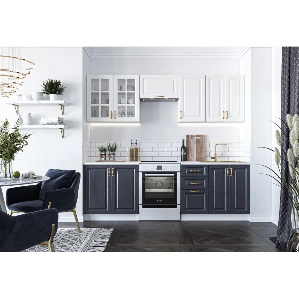 Kombinerar glamour, modern design och klassiska detaljer i en harmonisk helhet. Med en total längd på 240 cm ger detta gott om arbetsyta och förvaringsutrymme, perfekt för att skapa både funktionella och eleganta matlagningsmiljöer. Den stilrena kombinationen av vit och mörkblå front ger köket en lyxig och sofistikerad känsla.