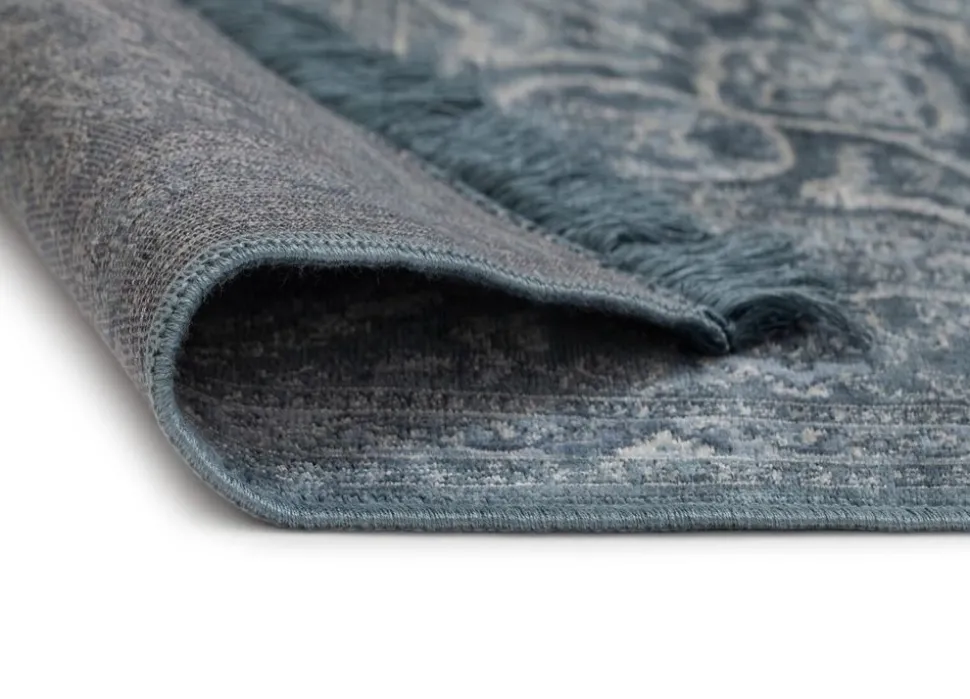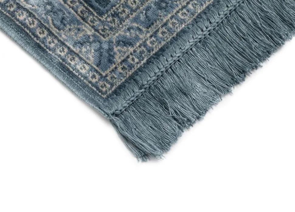 Casablanca Kashan har en blå bottenfärg med matchande langettering och vita fransar på kortändarna. Mattan har ett klassiskt orientaliskt mönster som går i beige, grå och vita toner.