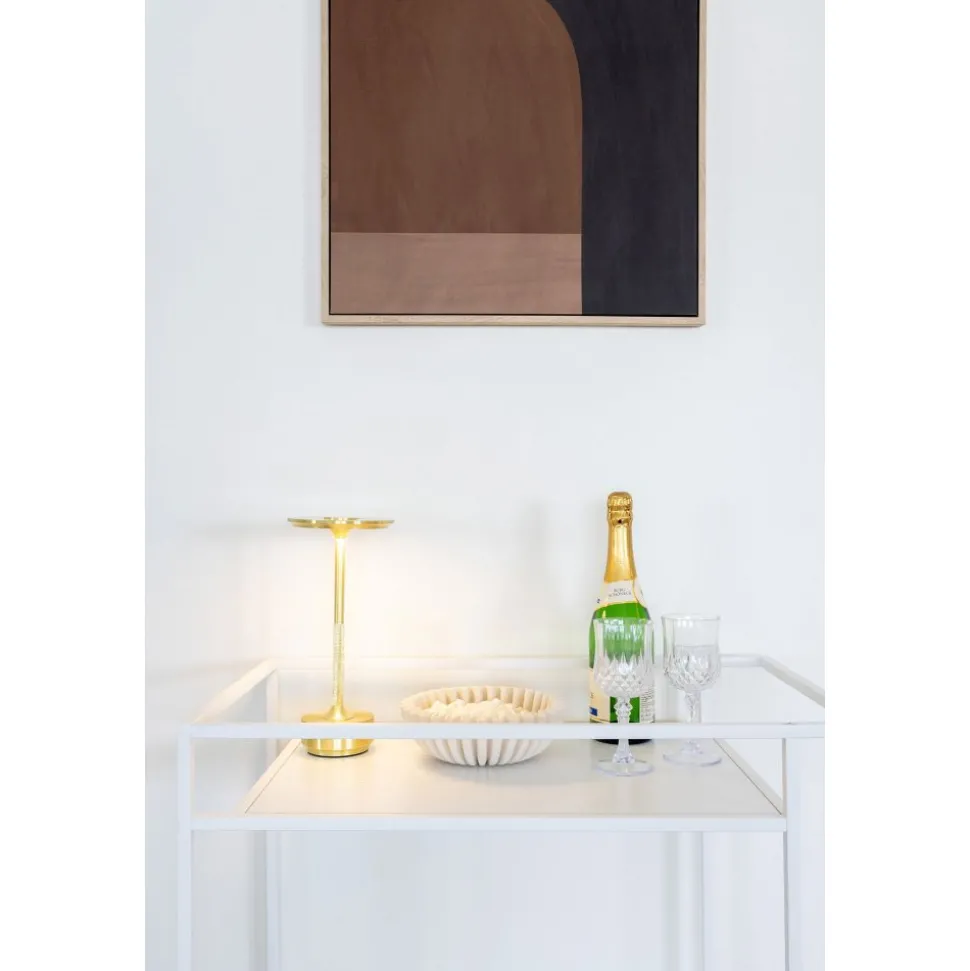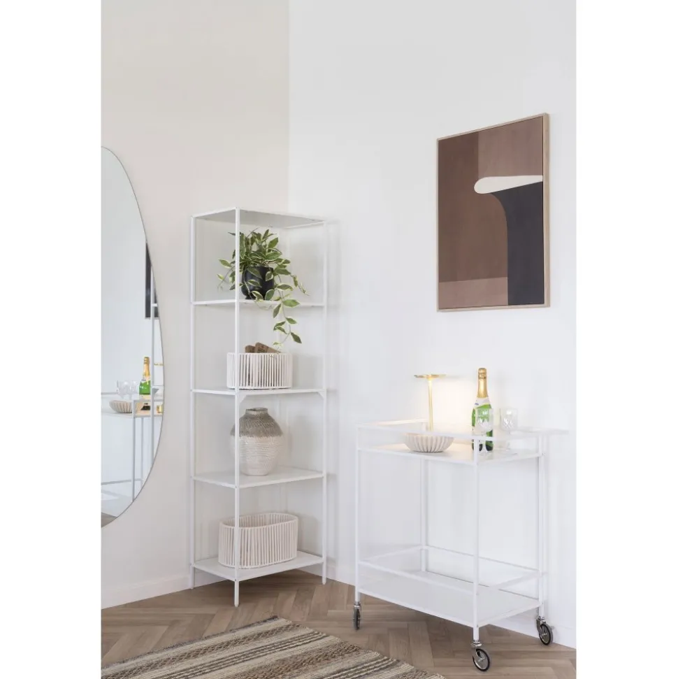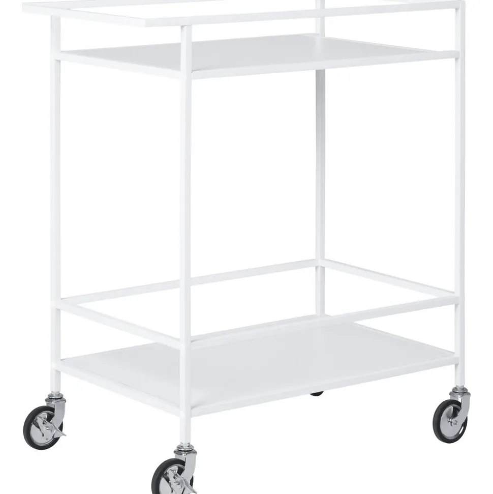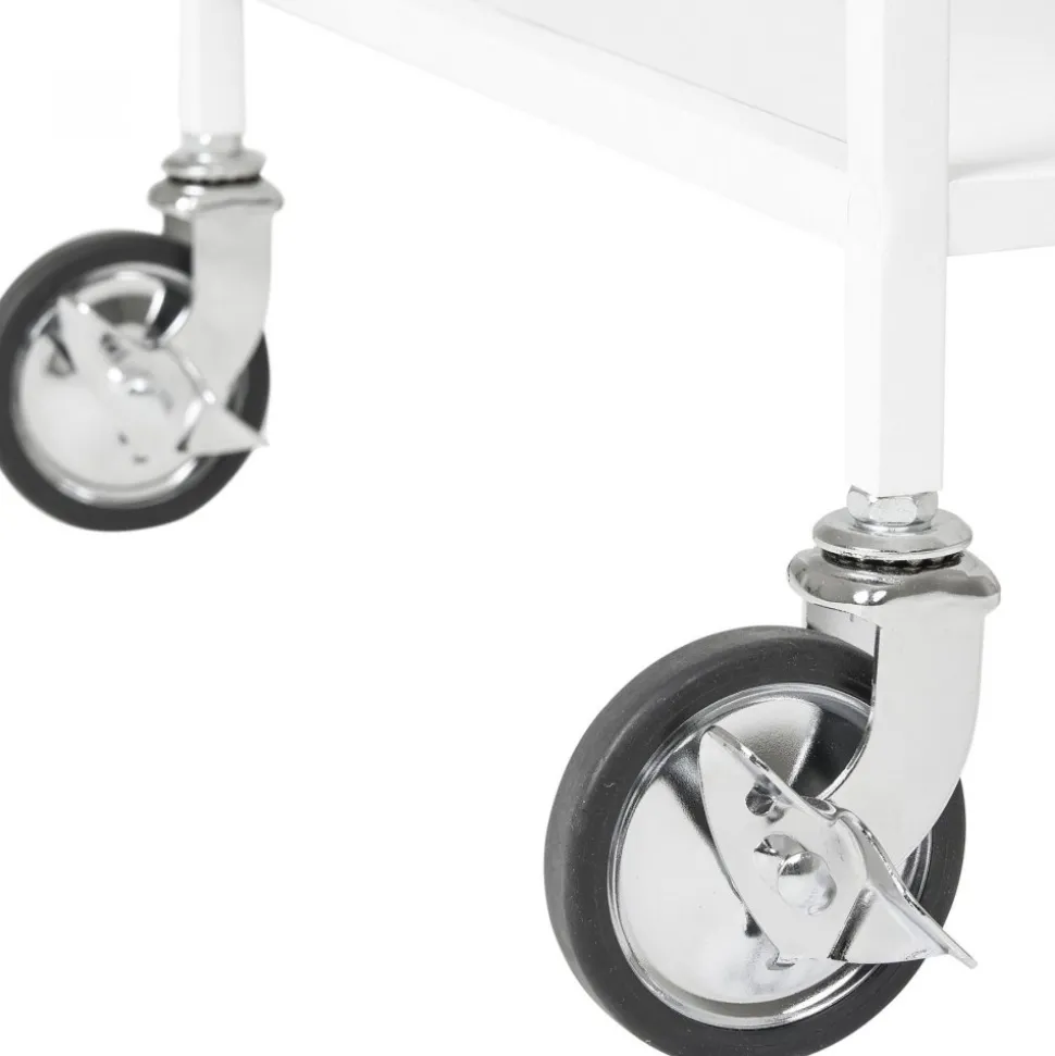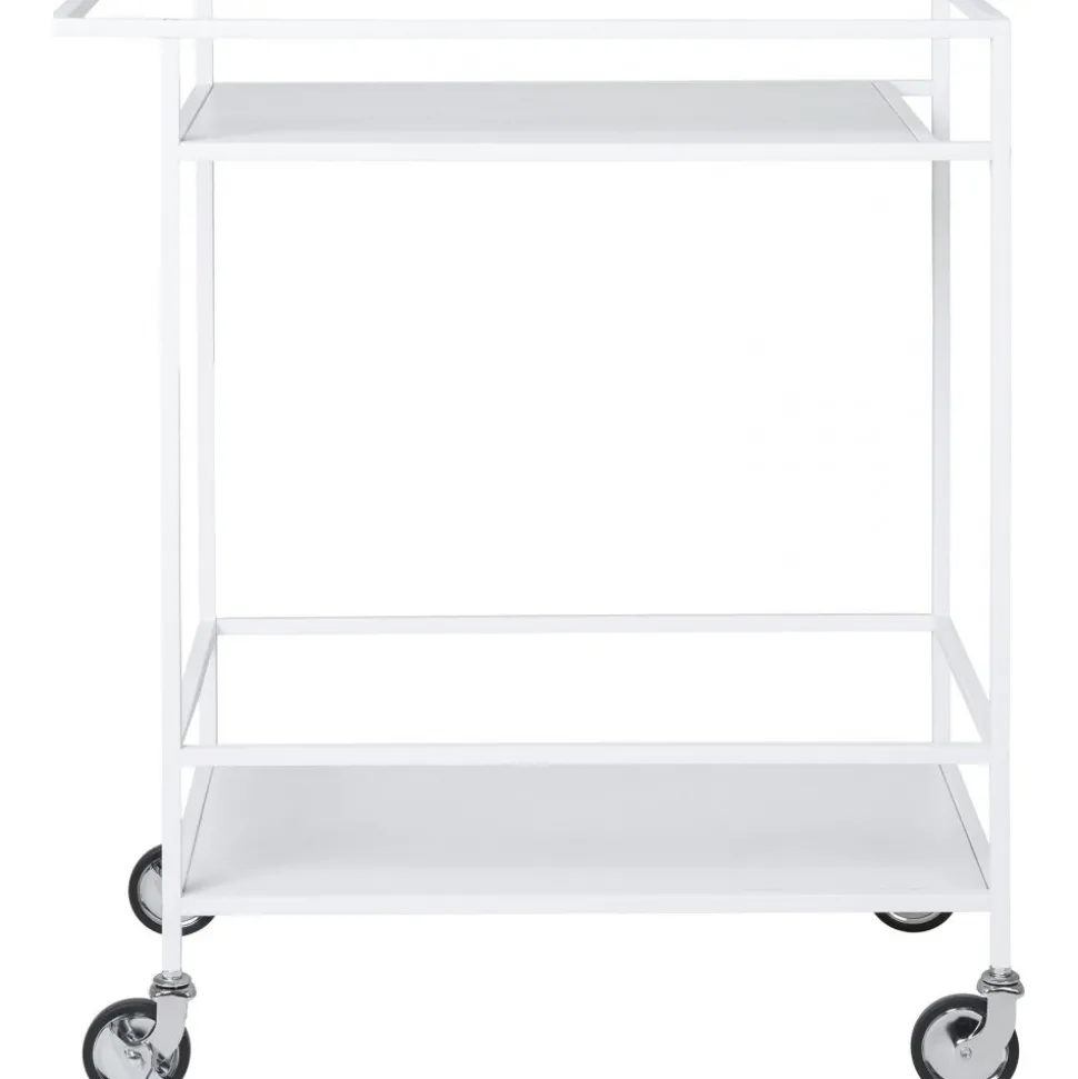 Serveringsvagn av stål och melaminbelagd spånskiva.