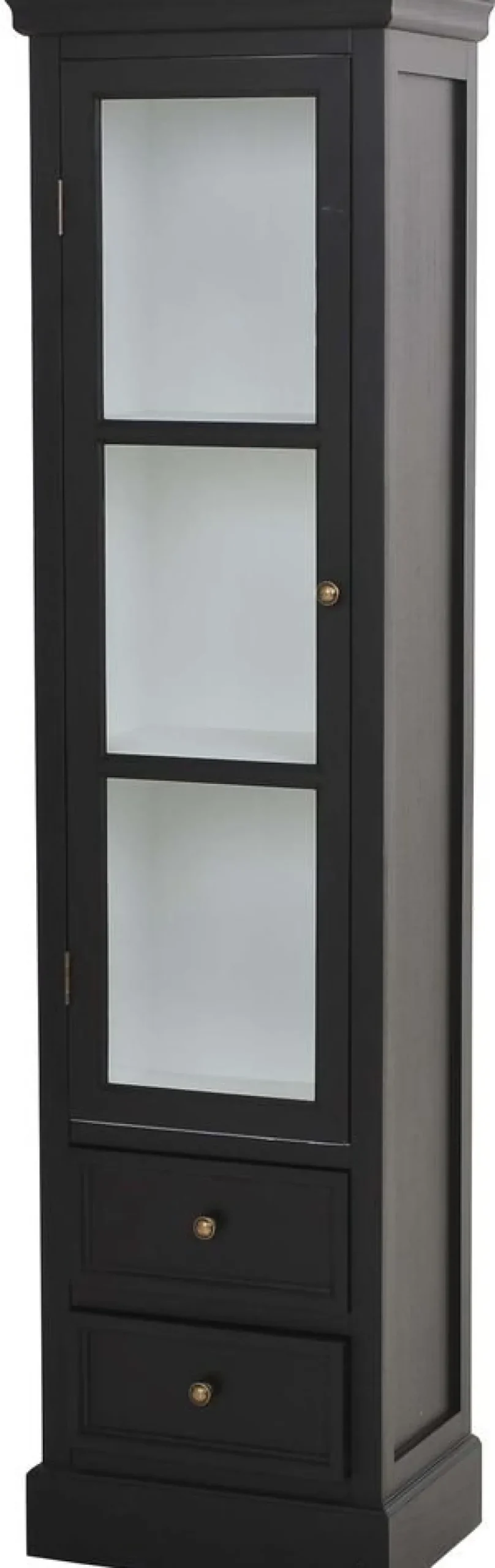 Robust i svart med 1 dörr i glas, vit insida av skåpet. Skåpet har 2 lådor nertill.