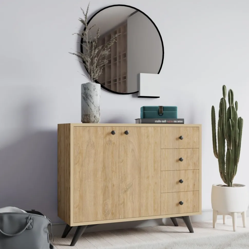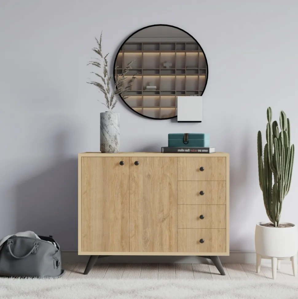 Förvaringsmöbel av melaminbelagd spånskiva.